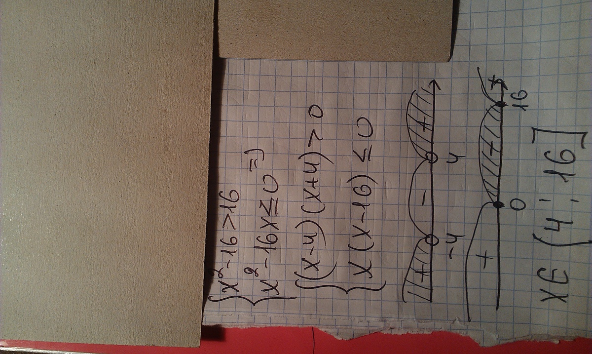 х в квадрате - 16 = (х-4)(х+4) > 0, на числовую прямую наносятся нулю каждого из множителей т.е. -4 и 4, и строго справа на лево, расставляются знаки +, -, +