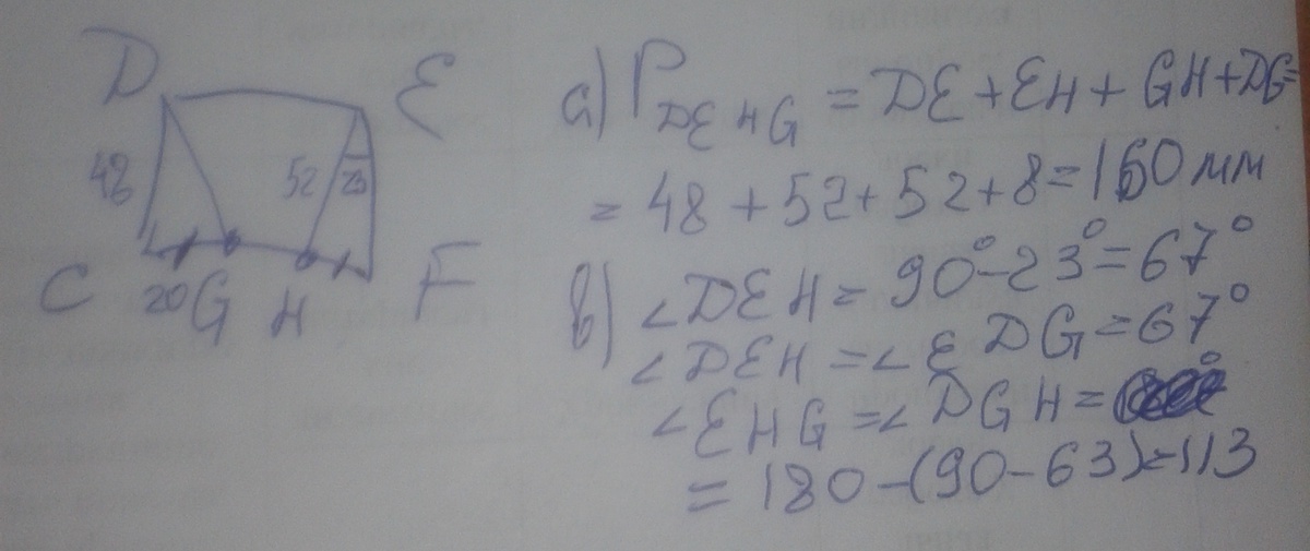b) углы четырехугольника DEHG, учитывая, что <FEH = 23 градуса.