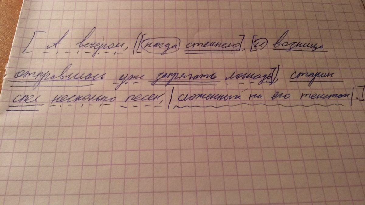 помогите пожалуйста, синтетический разбор предложения "А вечером, когда стемнело и возница отправилась уже запрягать лошадь, старик спел несколько песен, сложенных на его текстах"