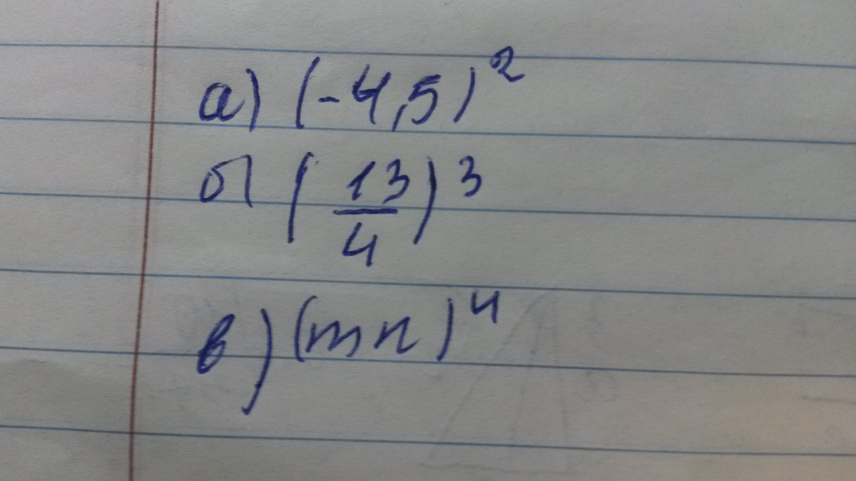 запишите в виде выражения:а) квадрат -4,5 б)куб 13/4 дробь в) четвертую степень произведения чисел m и n