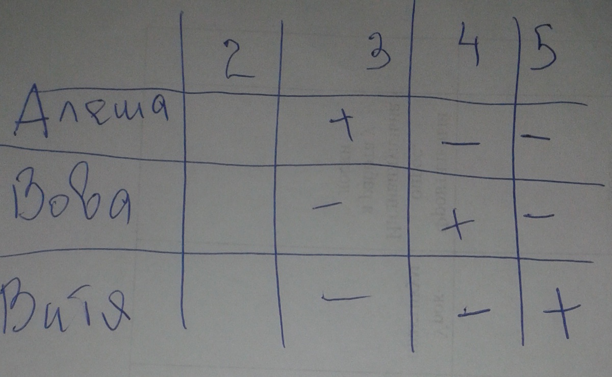 Алёша , Вова и Витя писали контрольную работу.Когда обьявляли оценки учительница сказала что у Вити не 4, а у Алёши не 4 и не 5.Какие оценки у трёх ребят?
