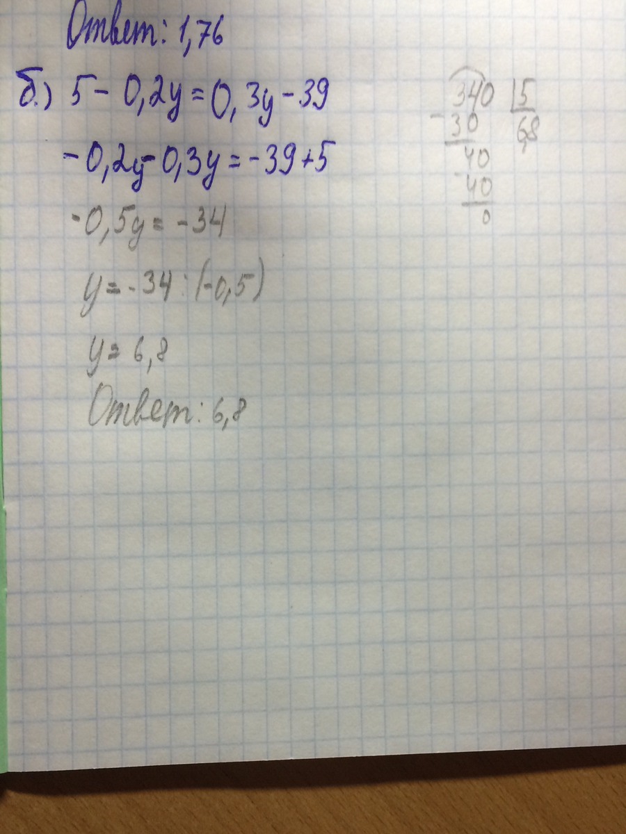 Помогите понять, в чём допущена ошибка. Вот фото как я делал, пример вот: 5-0,2y=0,3y-39. Может я и правильно сделал, не знаю.