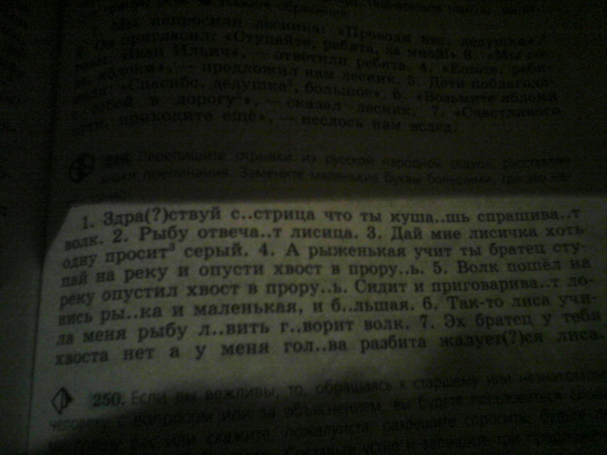 "Здравствуй, сестрица, что ты кушаешь? "- спрашивает волк. "Рыбу",- отвечает лисица. "Дай мне, лисичка, хоть одну",- просит серый. А рыженькая учит: " Ты братец, ступай на реку и опусти хвост в прорубь".Волк пошёл на реку, опустил хвост с прорубь. Сидит и приговаривает: " Ловись, ловись рыбка и маленькая, и большая. " "Так-то лиса учила меня рыбу ловить",- говорит волк. "Эх, братец, у тебя хвоста нет, а у меня голоса", - разбита жалуется лиса.