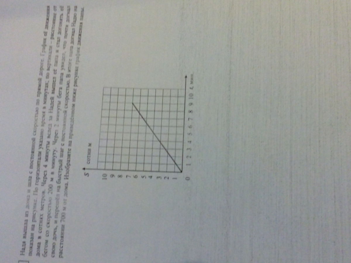 надя вышла из дома и шла с постоянной скоростью по прямой дороге. График её движения показан на рисунке. По горизонтали указано время в минутах; по вертикали - расстояние от дома в сотнях метров. Через 4 минуты вслед за Надей вышел её папа и стал догонять её бегом со скоростью 200 м в минуту. Через 2 минуты бега папа увидел ,что почти догнал свою дочь и перешел на быстрый шаг с постоянной скоростью. В итоге папа догнал Надю на расстоянии 700 метров от дома. Изобразите на приведенном ниже рисунке график движения папы.