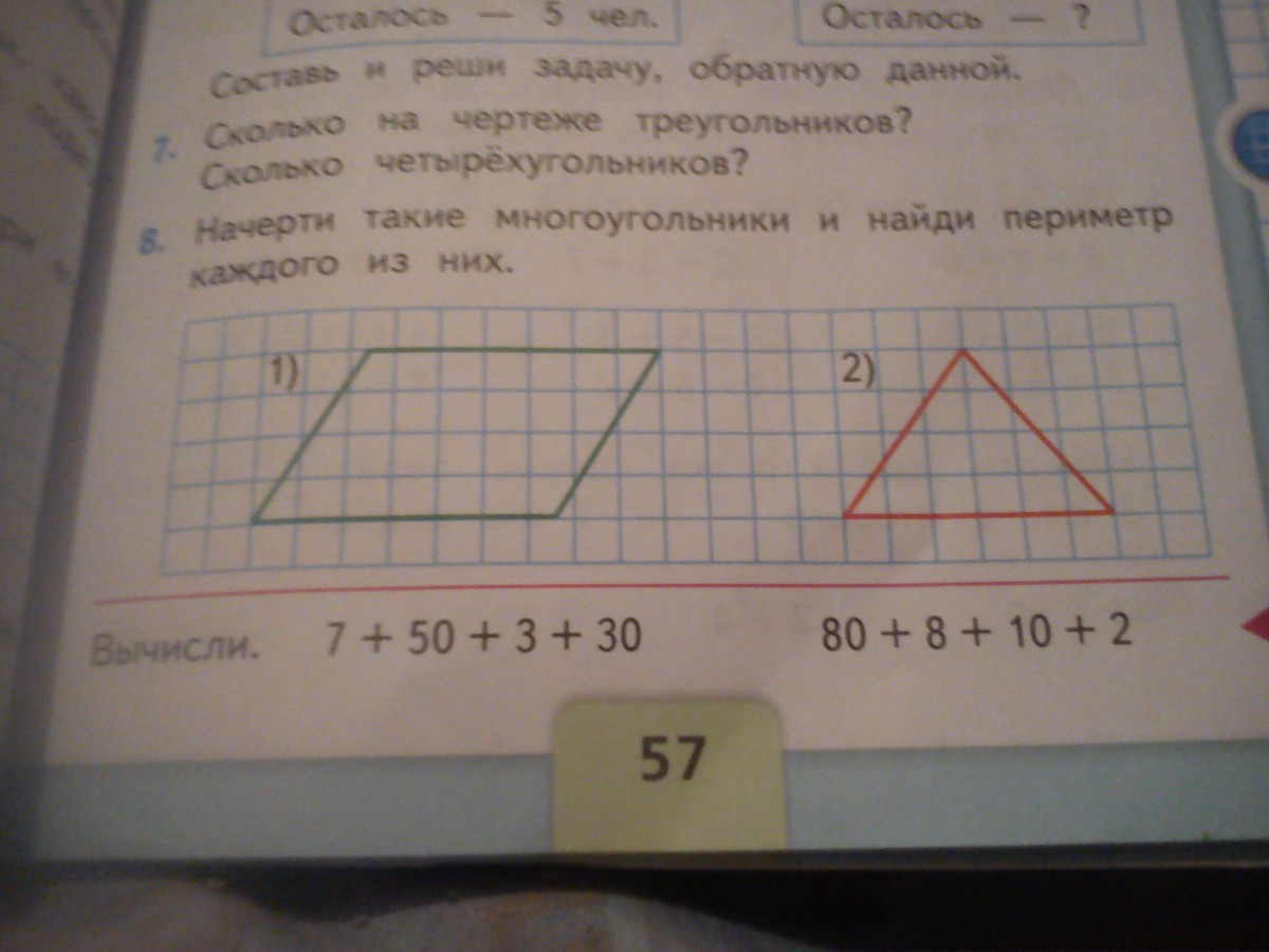 начерти такие многоугольники и найди периметр каждого из них . вычисли.7+50+3+30, 80+8+10+2,