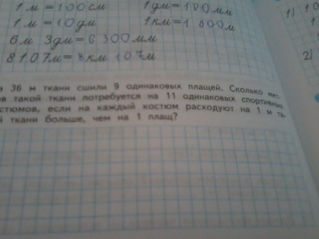 из 36 метров ткани сшили 9 одинаковых плащей. Сколько метров ткани потребуется на одиннадцать спортивных костюмов если на каждый костюм изросходуют на 1 метор такой ткани