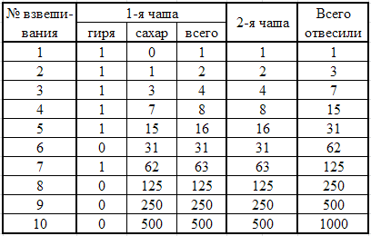 Дан мешок сахарного песка,чашечные весы и гирька в 1 г.Можно ли за 10 взвешиваний отмерить 1 кг сахара
