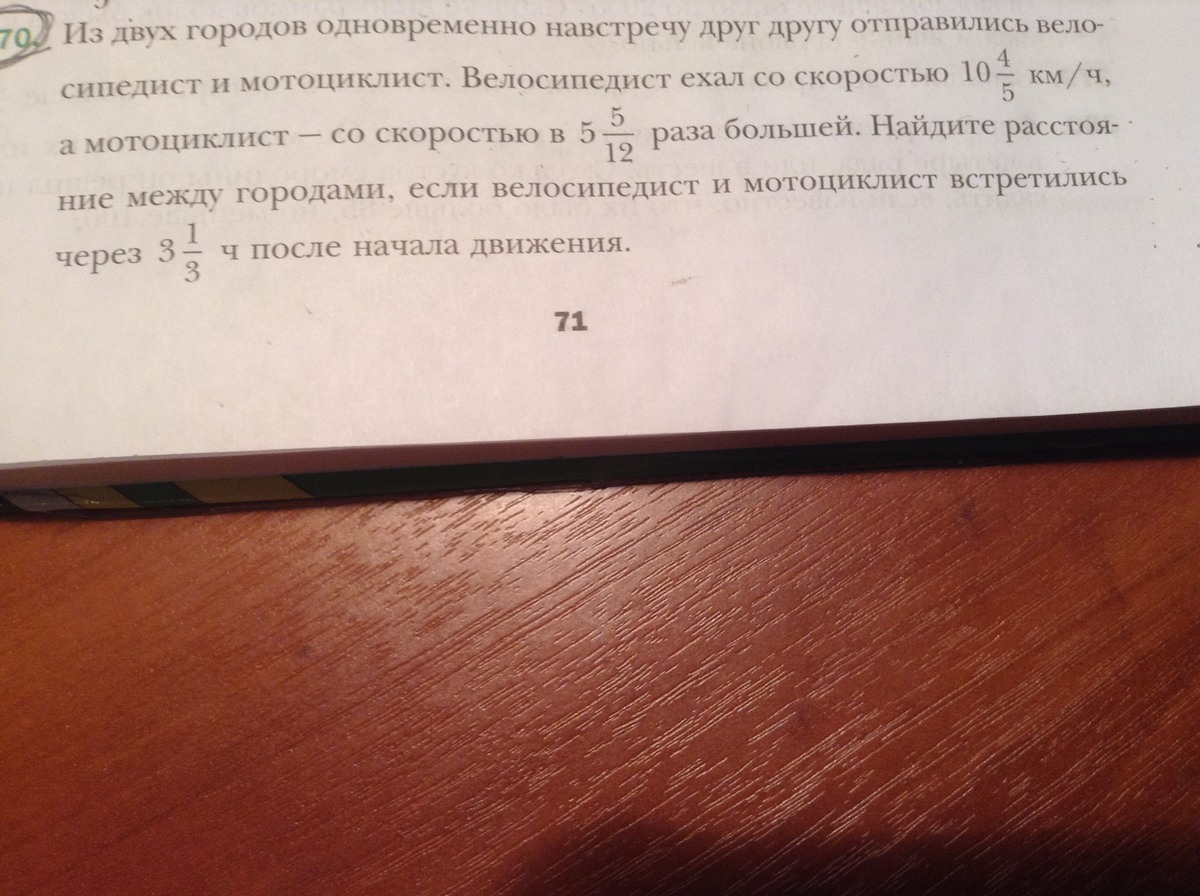 Из двух городов одновременно навстречу друг другу отправились велосипедист и мотоциклист .Велосипедист ехал со скоростью 10целых четыре пятых км/ч ,а мотоциклист -со скоростью в 5 целых пять двенадцатых раза большей.Найдите расстаяние между городами , если велосипедист и мотоциклист встретились через 3 целых одна третья после начала движения ! Я в 6 классе ! Помогите мне пожалуйста ! Если вы не поняли посмотрите фотку!!!