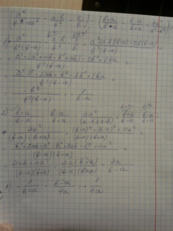 ((а2/b3-ab2) - (a-b/b2) - (2/b)) : ((a+b/b-a) - (b-a/b+a) - (4a2/a2-b2))