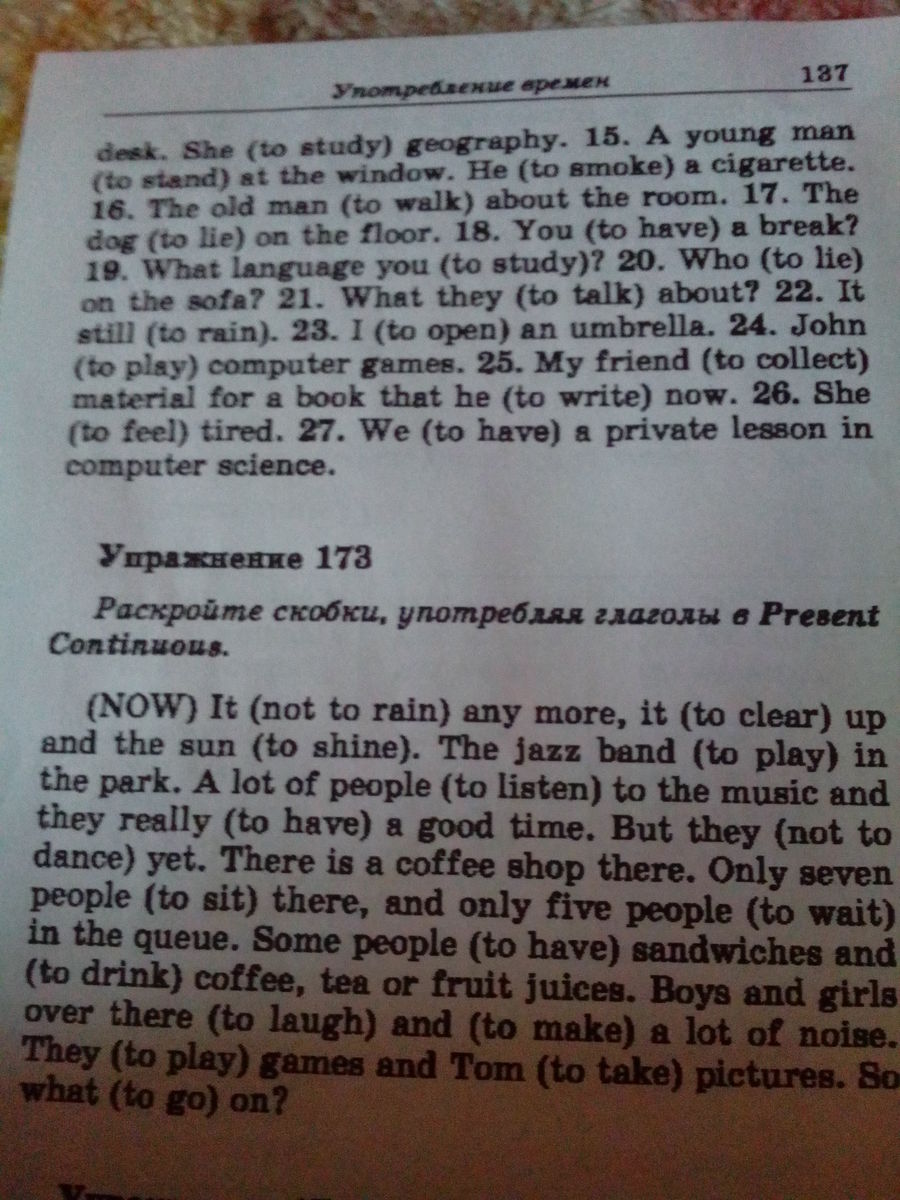 (Сейчас это (не дождь) больше, он (очистить) и солнце (до блеска). Джаз-бэнд (играть) в парке.много людей (слушать) на музыку, и они действительно (в есть) хорошо провести время. Но они (не танцевать) еще. Существует кафе есть. Только семь человек (сидеть) там, и только пять человек (ждать в очереди. Некоторые люди (иметь) бутерброды и (пить) кофе, чай или фруктовые соки. Боя и девочки там (смеяться) и (чтобы) много шума. Они (играть) игры и Том (взять) фотографии. Бо, что (идти на ?