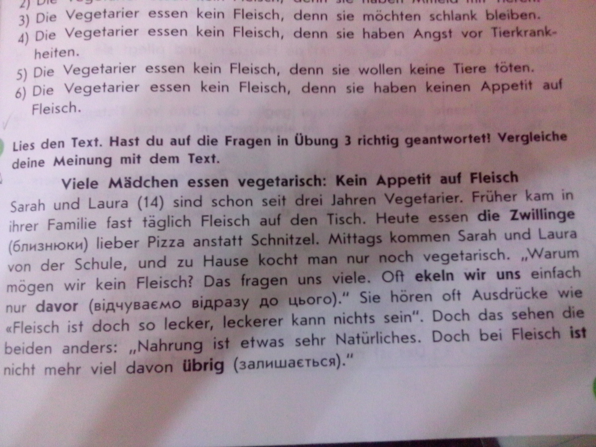 Сара и Лаура уже три года вегетарианки. Раньше в их семье почти каждый день на столе было мясо. Сегодня близняшки охотнее съедят пиццу вместо шницеля. В обед Сара и Лаура приходят со школы, а дома приготовлено только вегетарианское. Почему вы не любите мясо? Многие нас спрашивают. Часто мы просто чувствуем отвращение к этому. Часто они слышат выражение: Мясо такое вкусное, ничего вкуснее нет. Но обе считают по-другому: Питание это что-то естественное. Но у мяса нет ничего такого.