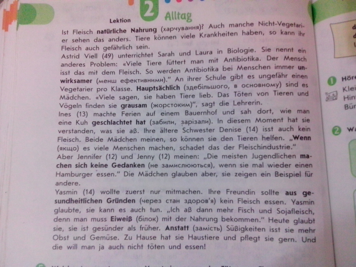 Астрид Вилл преподает Саре и Лауре биологию. Она называет другую проблему: многих животных кормят антибиотиками. Человек кушает их вместе с мясом. Таким образом антибиотики будут для человека неэффективными. В их школе есть примерно один вегетарианец на класс. В основном это девочки. "Многие говорят, они любят животных. Они считают жестоким убийство животных и птиц," - говорит учительница.
