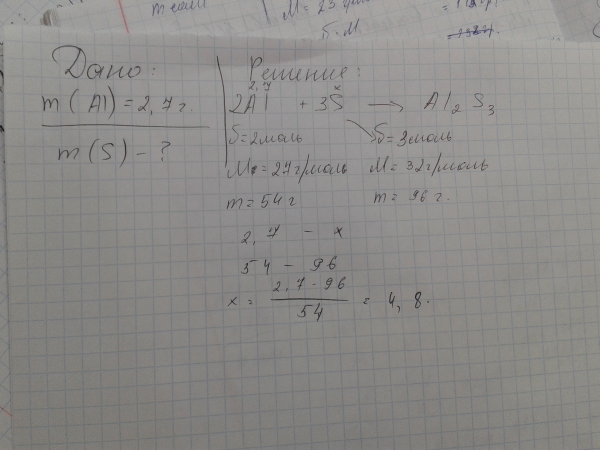 Дано: m(Al) = 2,7 гр. Найти: m(s), решите по хим уравнению Al + S = Al2S3. Найти массу элементов правой части уравнения. Решите пожалуйста! Можно сразу решение правой части.