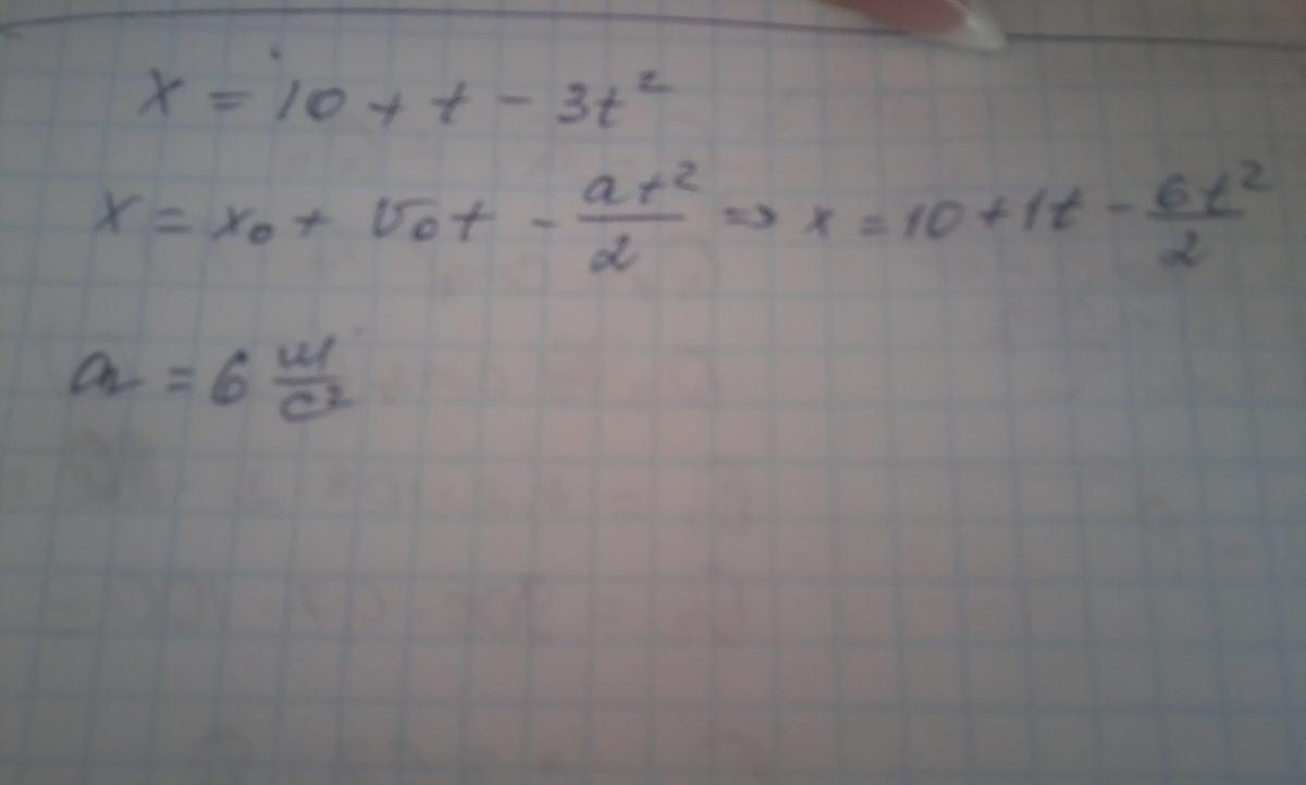 Точка движется вдоль оси Х согласно закону: x=10+t-3t2. Модуль ускорения движущейся точки равно: 1) 10м/с2; 2) 1м/с2; 3) 6м/с2; 4)3м/с2; 5)2м/с2.
