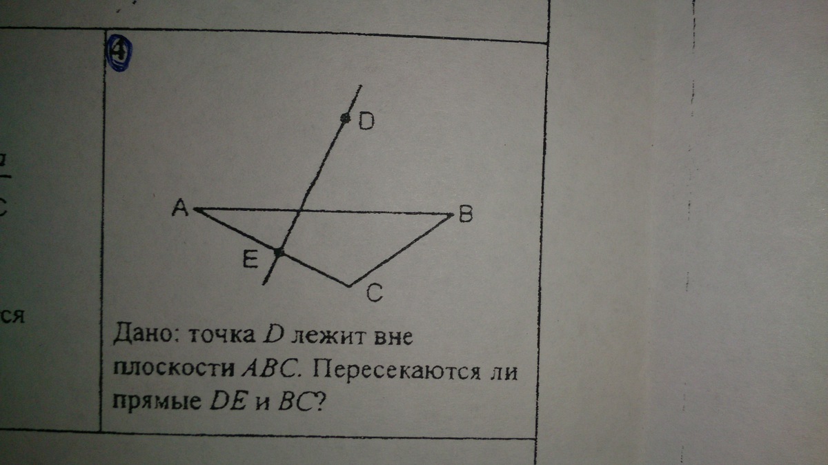 дано: точка D лежит вне плоскости ABC. пересекаются ли прямые DE и BC?