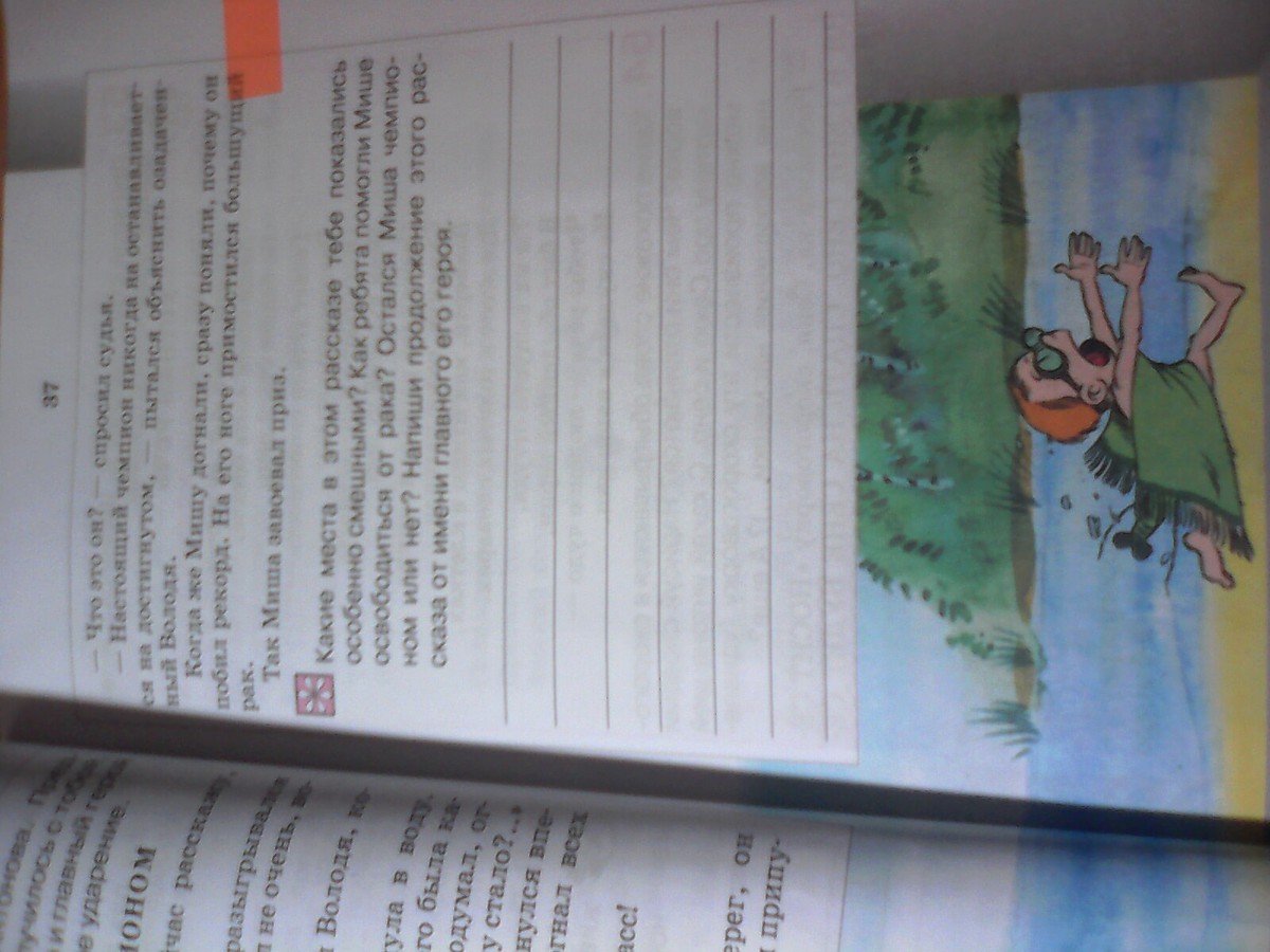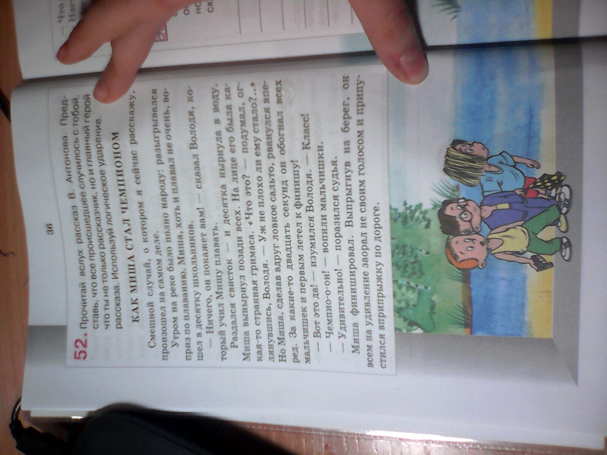 Рассказ: Утром на реке было много народу, разыгрывался приз по плаванию. Плавал я не очень, точнее вообще не умел, но меня учил мой друг Володя. Володя верил в меня и сказал:" -ничего, он вам еще покажет!". Раздался свисток, я прыгнул в воду, но вынырнул самым последним. Вдруг что-то хватает меня за ногу, мне стало очень страшно, так что я без труда долетел до финиша быстрее всех и выиграл! Все стали ликовать, а я выбежал с реки и понеся по всему берегу крича. Когда меня догнали друзья они помогли мне, ну, а я с великой победой жил дальше.