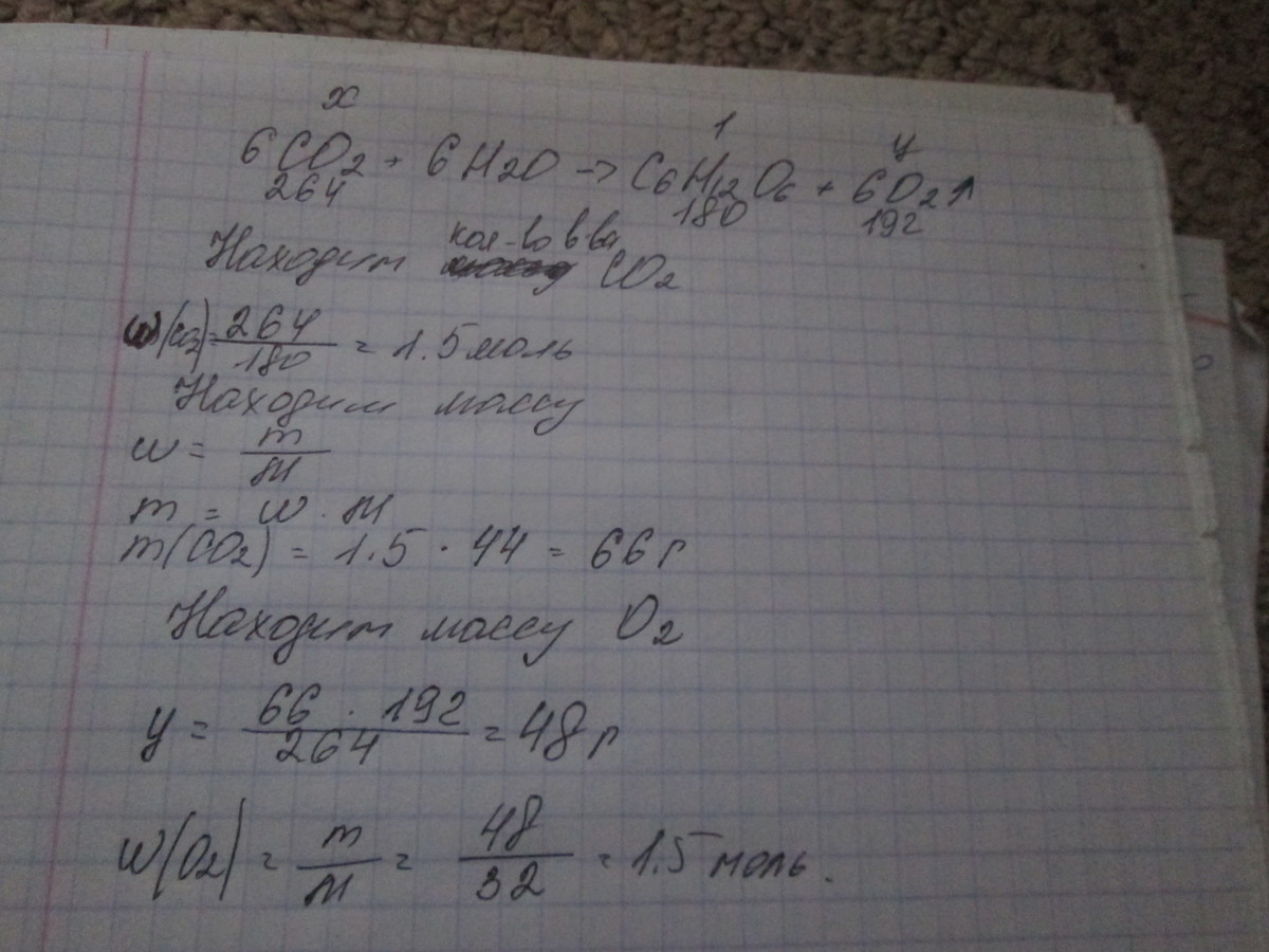 запишите химическое уравнение реакции получения глюкозы путем фотосинтеза. Сколько тратится углекислого газа и выделяется кислорода для получения 1 моль C6H12O6