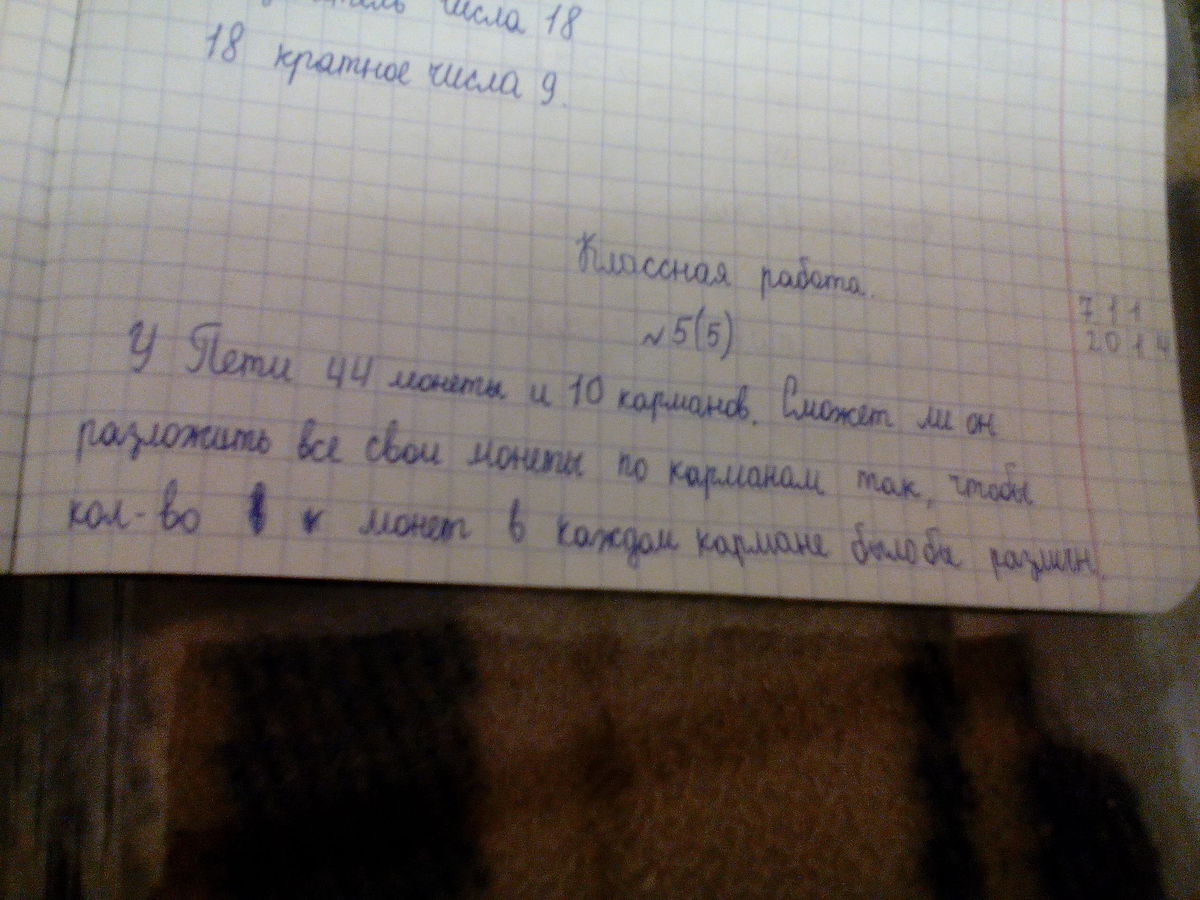 у Пети 44 монеты и 10 карманов. Сможет ли он разложить все свои монеты по карманам так, чтобы кол-во монет в каждом кармане было бы различным.( оно может равняться 0 )