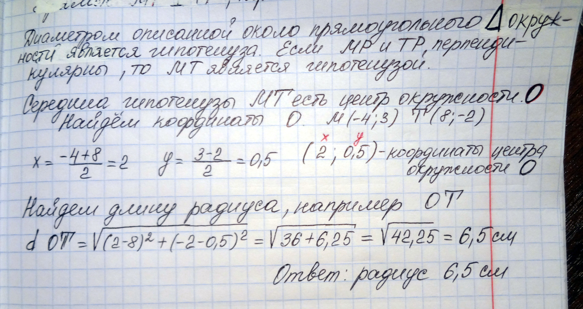 8.Даны координаты вершин треугольника МРТ:М (-4;3) Р(2;7) Т(8;-2). Докажите, что данный треугольник прямоугольный, и найдите радиус описанной около него окружности.