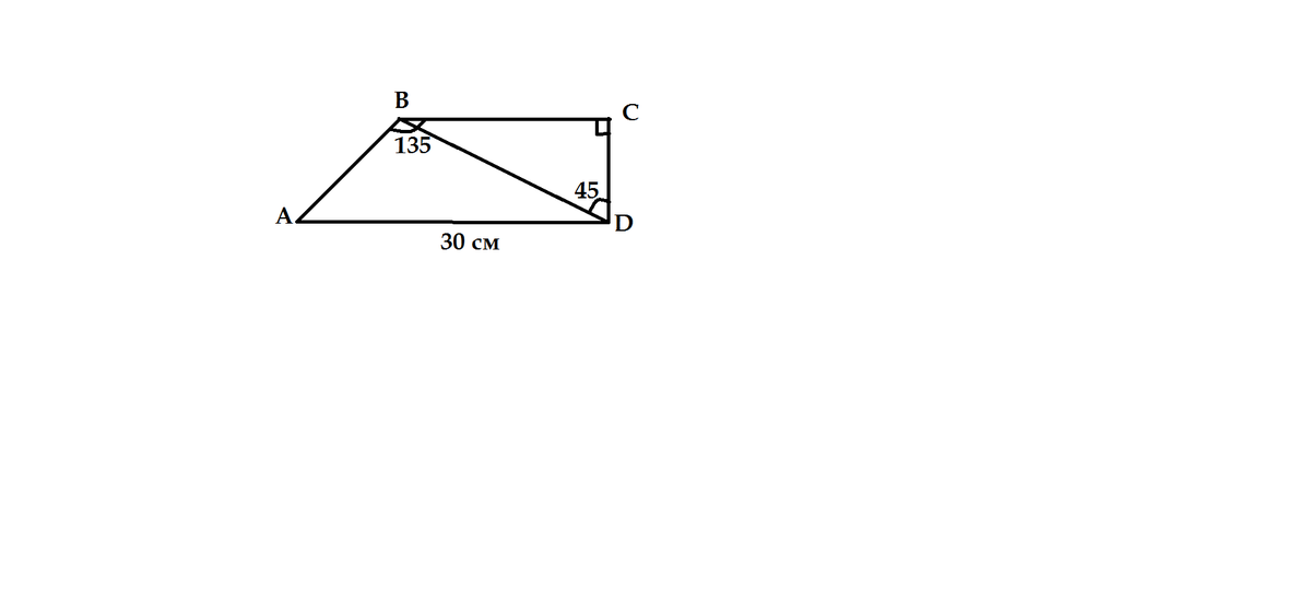 В ΔВСД угол СВД= углу ВДС=45, значит треугольник равнобедренный ВС=СД. В ΔАВД <АВД=135-45=90, < ВДА=90-45=45, тогда и <ВАД=45, значит и этот треугольник равнобедренный АВ=ВД. По т. Пифагора АД²=АВ²+ВД²=2*ВД², откуда ВД²=30²/2=450. Аналогично ВД²=ВС²+СД²=2ВС², ВС²=450/2=225, ВС=15 см.