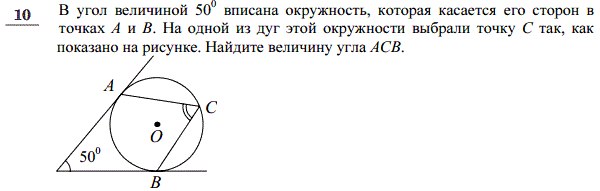 Угол АОВ=180-50=130 градусов. Величина вписанного угла АСВ равна половине величины центрального угла АОВ, опирающегося на ту же дугу, значит угол АСВ=130/2=65 градусов.