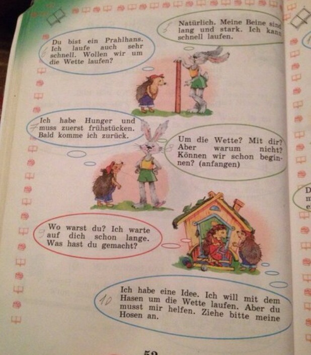 Hase(Заяц) - Конечно! Мои ноги длинные и сильные. Я могу быстро бегать.Igel(Ёж)- Ты хвастун! Я тоже очень быстро бегаю! Давай пари по бегу!