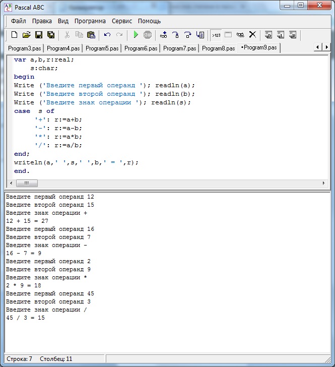 Составьте программу, которая имитирует работу арифметического калькулятора. Организуйте ввод первого и второго операндов и знака операции.
