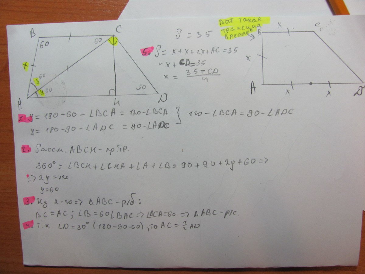 1. Или трапеция не получается, так как противолежащие углы трапеции не могут быть острыми оба, или тупыми оба. (посмотрите рисунок на втором листе)