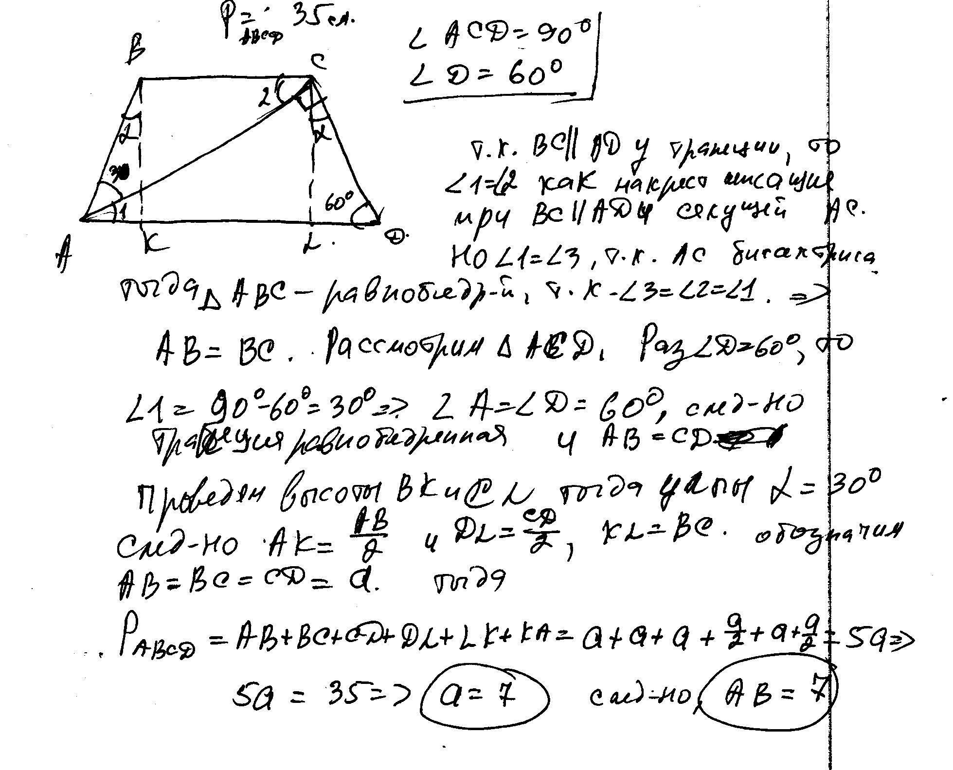в трапеции ABCD диагональ AC перпендикулярна боковой стороне CD и является биссектрисой угла A.найдите длину AB,если периметр трапеции равен 35 см,а угол В равен 60 градусов