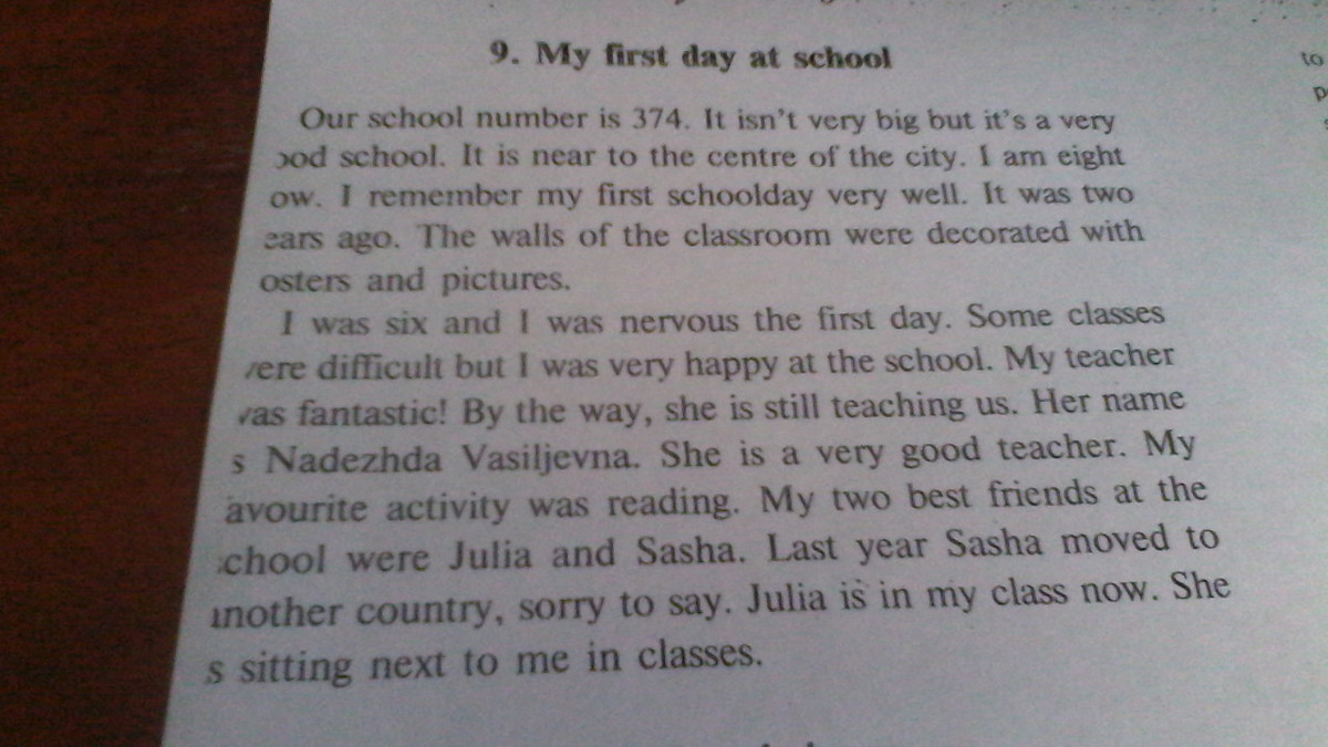 В школе номер 374.Это не очень большая но очень хорошая школа.Она в центре города.Мне 8 лет.Я помню мой первый день в школе очень хорошо.Это было два года назад.Стены моего класса были очень разукрашены картинами и постерами.