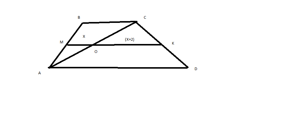 Пусть диагональ АС делит среднюю линию МК на отрезки МО=х и ОК=(Х+2). Поу словию средняя линия равна 10, значит