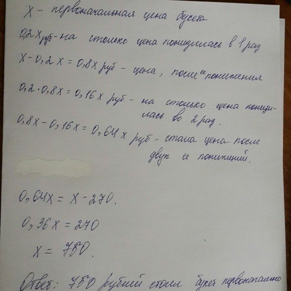 цена букета из роз дважды понижалась на 20 % сколько стоил букет из роз первоначально если после понижений цена уменьшилась на 270 руб