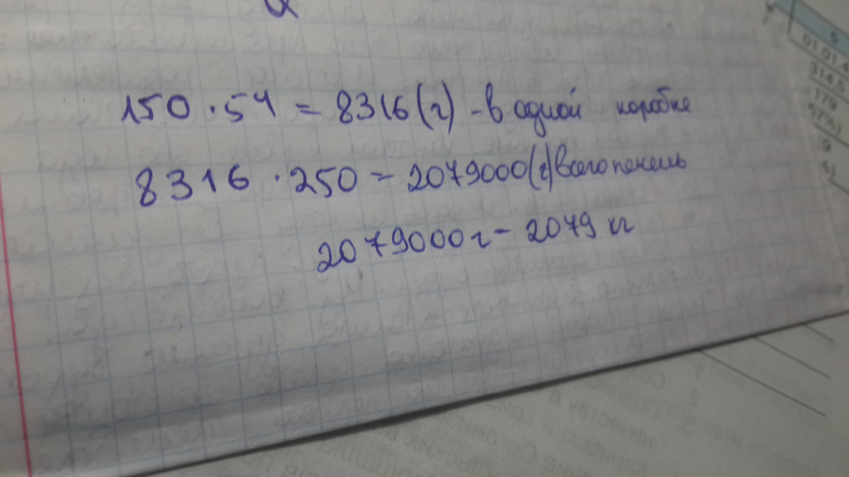 1. Найдем массу 54 пачек печения ( масса 1 коробки с печеньем):