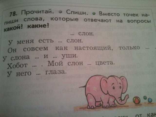 прочитай спиши вместо точек напиши слова которые отвечают на вопросы КАКОЙ? КАКИЕ?. .... слон у меня есть .... слон. он совсем как настоящий, только .... у слона ..... и ..... уши хобот ..... мой слон ...... цвета у него ..... глаза ОБРАЗЕЦ хобот длинный.