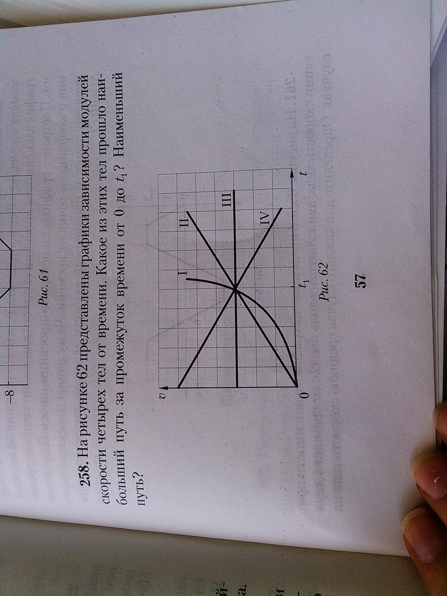 На рисунке представлен график зависимости модулей скорости четырёх тел от времени. Какое из этих тел прошло наибольший путь за промежуток времени от 0 до t1 ? Наименьший путь?(Рисунок внутри)