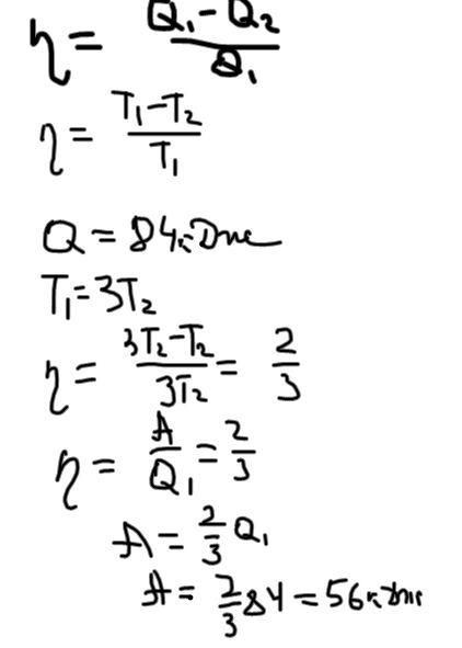 Газ, совершающий цикл Карно, получает от нагревателя 84 кДж теплоты. Найти работу газа за один цикл, если температура нагревателя в три раза больше температуры холодильника