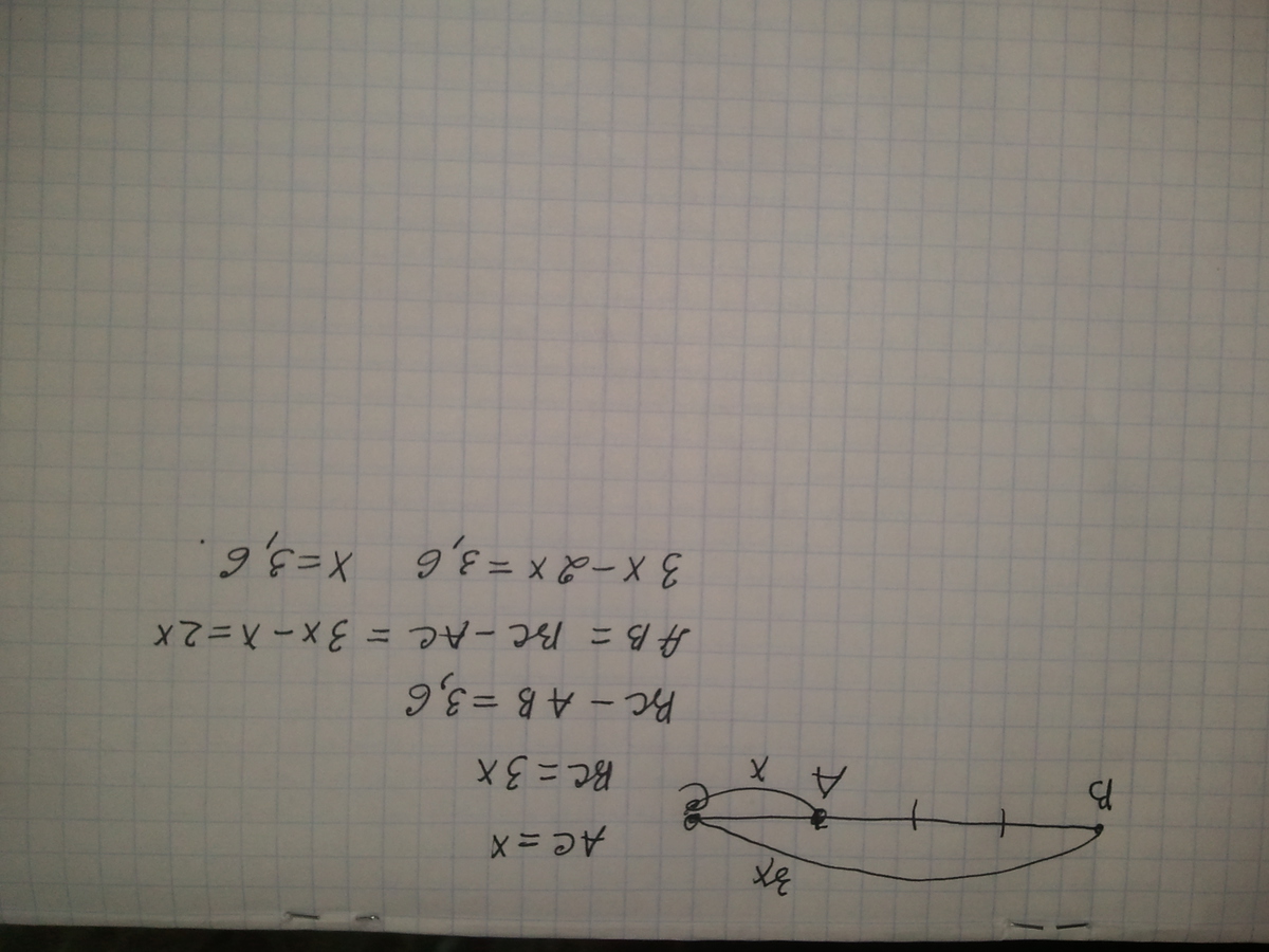 точки А,В и С лежат на одной прямой,причем длина отрезка ВС больше длины отрезка АС в 3 раза,а длина АВ меньше длины ВС на 3,6см.Найдите длину отрезка АС! Прошу помогите! Срочно к завтраму! Дам 100 баллов
