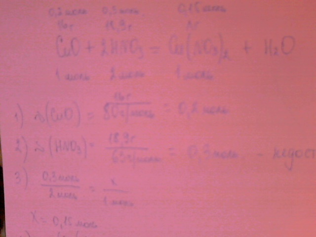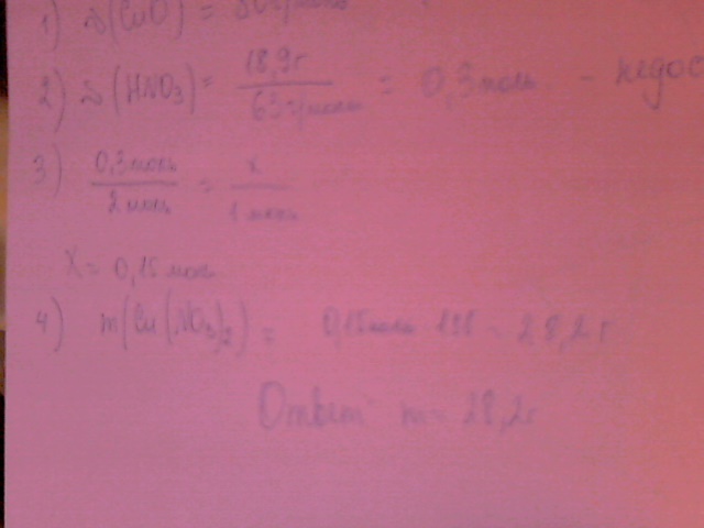 Вычислить массу соли,которая получиться при взаимодействии 18,9г азотной кислоты с оксидом меди2 массой 16г