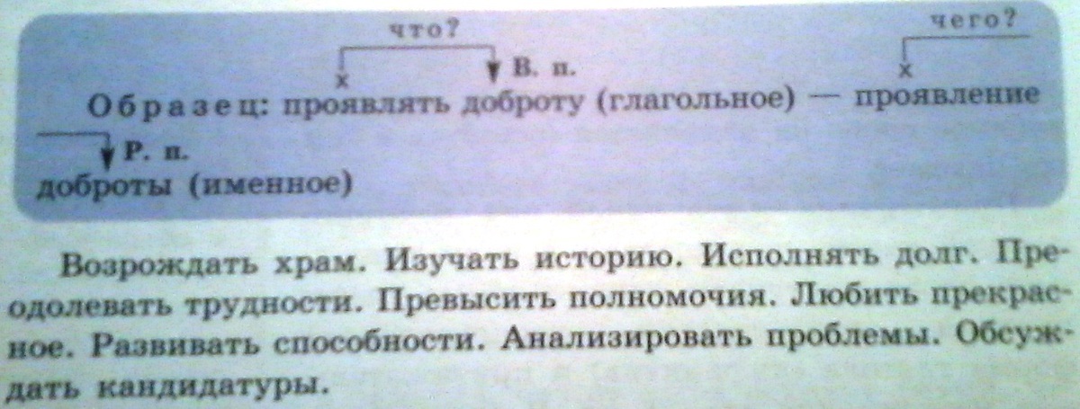 возрождать храм - возрождение храма, изучать историю - изучение истории, исполнять долг - исполнение долга, преодолевать трудности - преодоление трудностей, превысить полномочия - превышение полномочий, любить прекрасное- любовь к прекрасному, развивать способности - развитие способностей, анализировать проблемы - анализ проблем, обсуждать кандидатуры - обсуждение кандидатур.