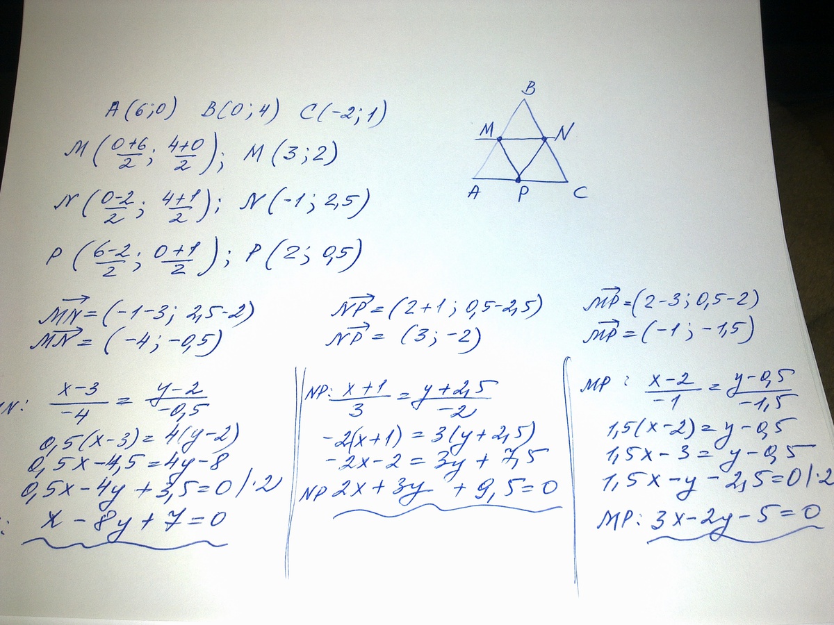 Известны координаты вершин треугольника:A (6; 0), B (0; 4),C (-2; 1). Написать уравнение прямых, содержащих средние линии треугольника.