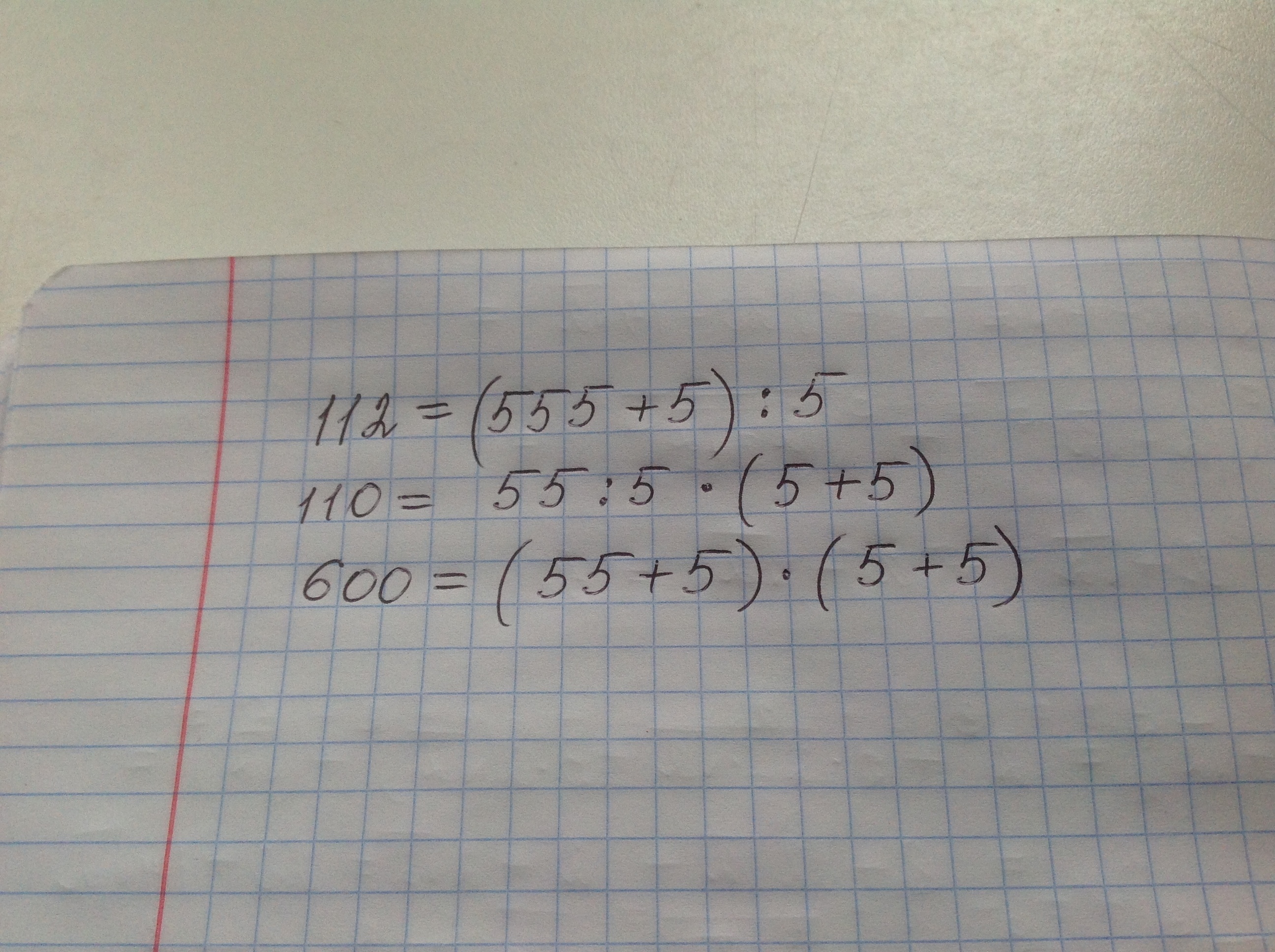 Используя пять цифр 5 и скобки (если потребуется),запишите числовое выражение, имеющее значение: 112=,600=,110=.