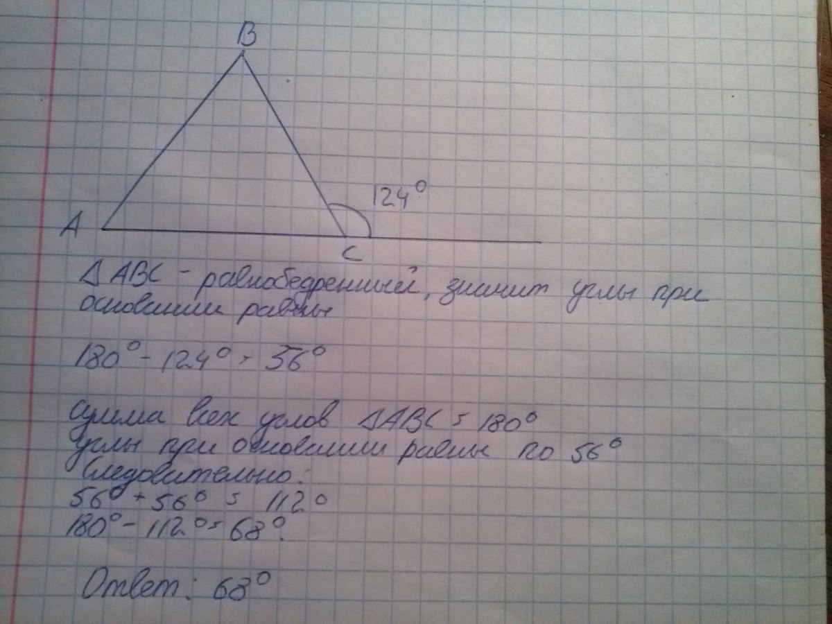 Внешний угол при основании равнобедренного треугольника равен 124 градуса. Найдите угол треугольника, противолежащий основанию.