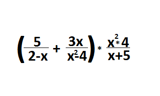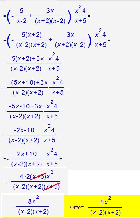 (5/2-x + 3x/x^2-4)*4x^2/x+5=(-2x-10)*(4x^2)/(x-2)(x+2)(x+5) =-8x^2/ (x-2)(x+2)