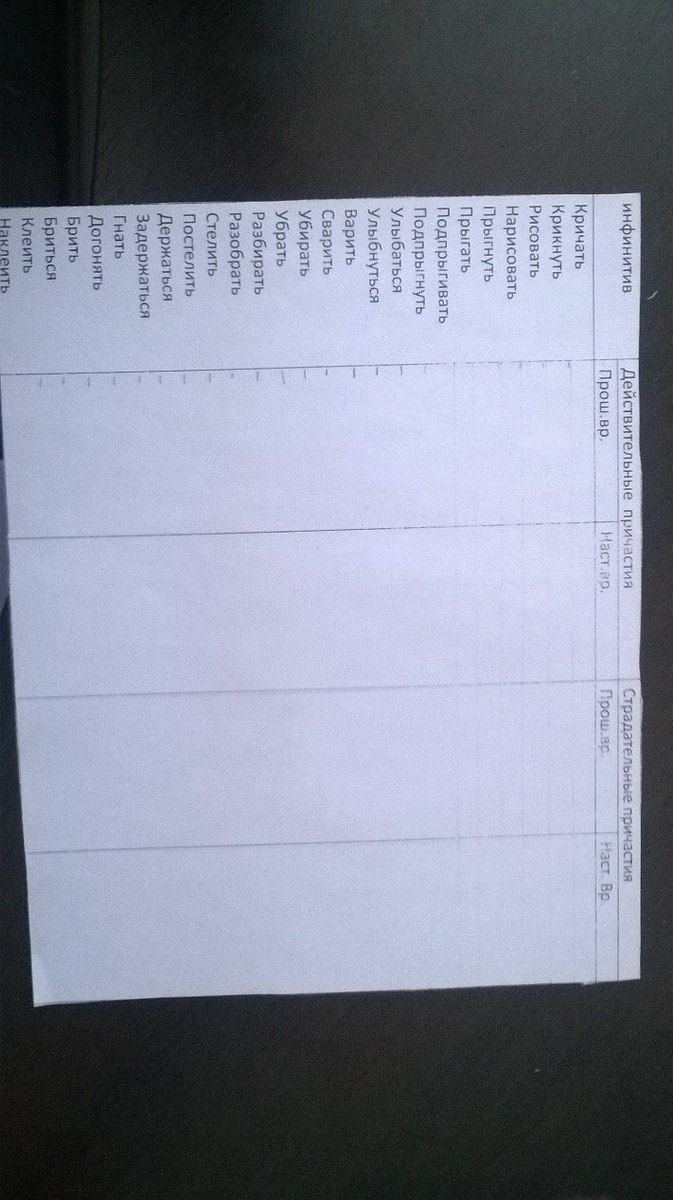 Д.п прошедшего вр. Кричавший, крикнувший, рисовавший, нарисовавший, прыгнувший,прыгавший, подпрыгивавший, подпрыгнувший,ушибавший, улыбавшийся, варивший, сваривший, убиравший, убравший, разбиравший,разобравший, стеливший, постеливший, державший, задержавший, гнавший, догнавший, бривший, брившийся, клейвший, наклеивший. Короче в Действительных причастий настоящего времени подставляй -ущ; -ющ; -ащ;-ящ;, в действ. прич. пр. вр. -ш; -вш;, страдательных прич. -ом;-ем;-им;, действ. прич. пр.вр. -т;-нн;-енн;-ённ;..