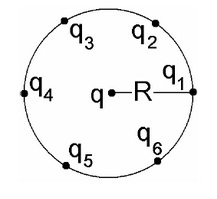 Шесть точечных зарядов с зарядами q =1 мкКл каждый , расположены на равном удалении от соседних зарядов на окружности радиуса R =1 м . Найти величину силы, действующей на точечный заряд q , помещенный в центр этой окружности.