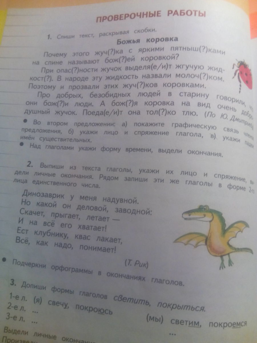 Почему эта жучка с яркими пятнышками на спине называют божьей коровкой? При опасности жучок выделяет жгучую жидкость.В народе эту жидкость назвали молочком .Поэтому и прозвали этих жучков коровками. Про добрых, безобидных людей в старину говорили, что они божьи люди.А божья коровка на вид очень добродушный жучок.Поедает она только тлю.(Выделенные слова-это глаголы) Называют-настоящее время. Выделяет-настоящее время.назвали-прошед.время. прозвали-прошед.время. говорили-прошед время. поедает-настояшее время.