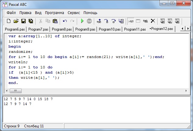Составьте программу, которая заполняет массив a [1..10] случайными целыми числами в диапазоне от 1 до 20 и выводит на экран элементы, значения которых больше 5 и меньше 15.