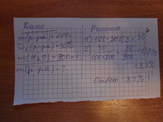 К 100 г 30% раствора добавлено 800 мл воды. Определить процентную концентрацию получимая раствора. Распишите подробно: дано, решение.