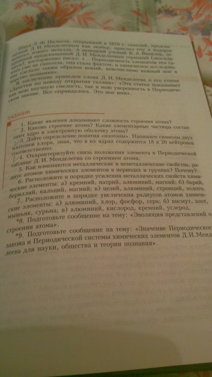 4). Зная положение ХИМИЧЕСКОГО ЭЛЕМЕНТА в периодической системе мы можем написать строение его атома. Например, алюминий Al, находится в пер. с-ме под номером 13, значит его заряд атома +13 и -13 электронов. Алюминий находится в третьем периоде, значит вокруг ядра у него три электронных уровня, на которых разместятся электроны. На первом уровне может быть не больше 2 электронов, на втором уровне не больше 8 электронов и на третьем уровне (Он находится в третьей группе главной подгруппе) значит на последнем уровне у него будет размешаться три электрона. Напишем схему строение атома алюминия в виде электронной формулы: