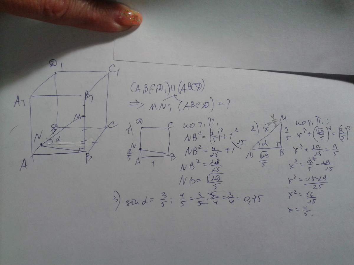 в кубе АВСДА1В1С1Д1 точка М лежит на ребре ВВ1 ,причем ВМ:МВ1=3:2 ,а точка N лежит на ребре АД ,причем AN:Nd=2:3.Вычислите синус угла между прямой MN и плоскость грани А1В1С1Д1.